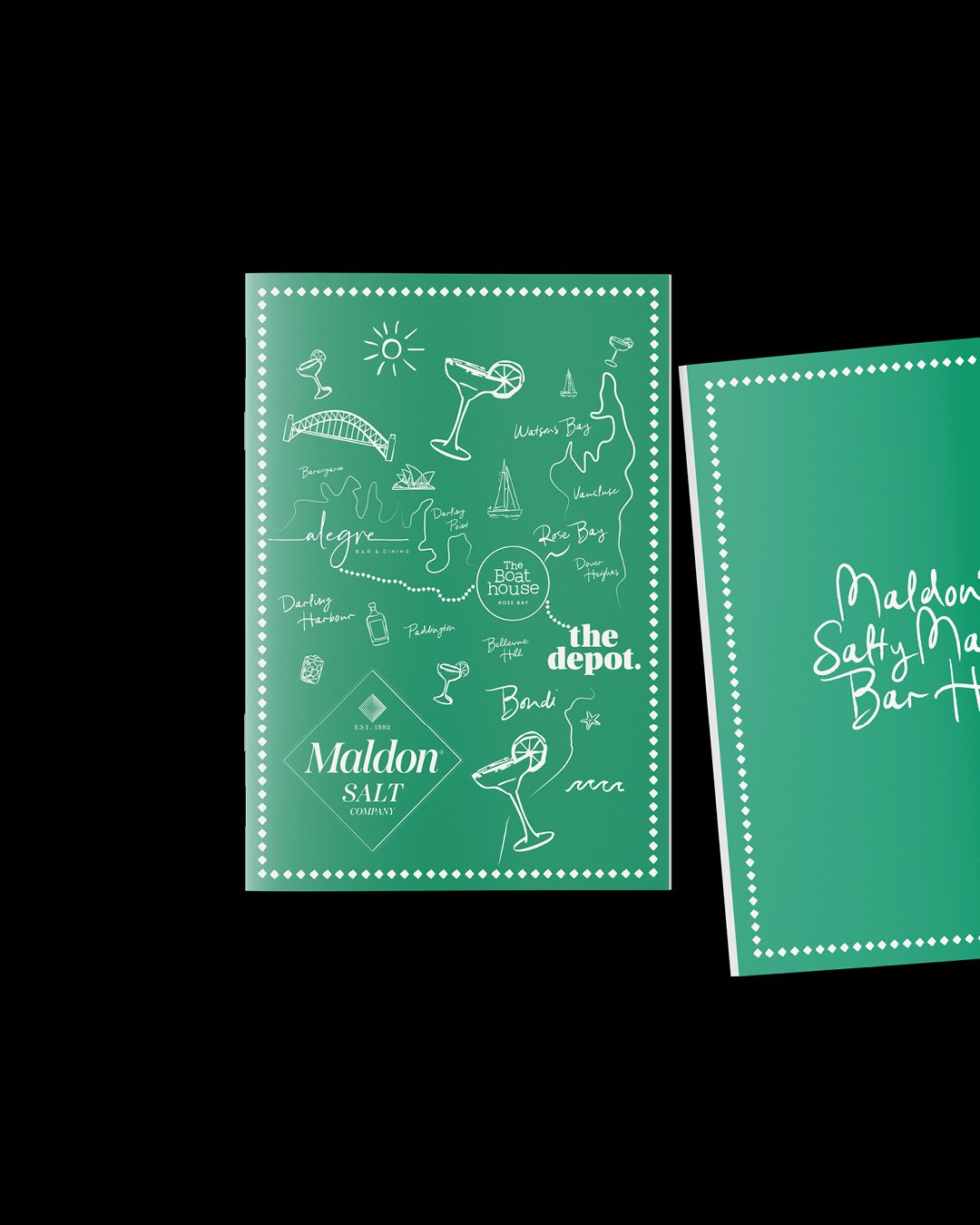 Maldon Salt event by the brilliantly talented Billy Etc. Billy briefed me to create a booklet and map of Sydney for the event, showcasing ‘Maldon’s Salty Marg Bar Hop’ route from The Depot → The Boathouse Rose Bay → Alegre Bar & Dining. The idea was to feature the map as the front page of a mini booklet, with each venue having its own page inside, with questions for rating Sydney’s best Maldon margarita.