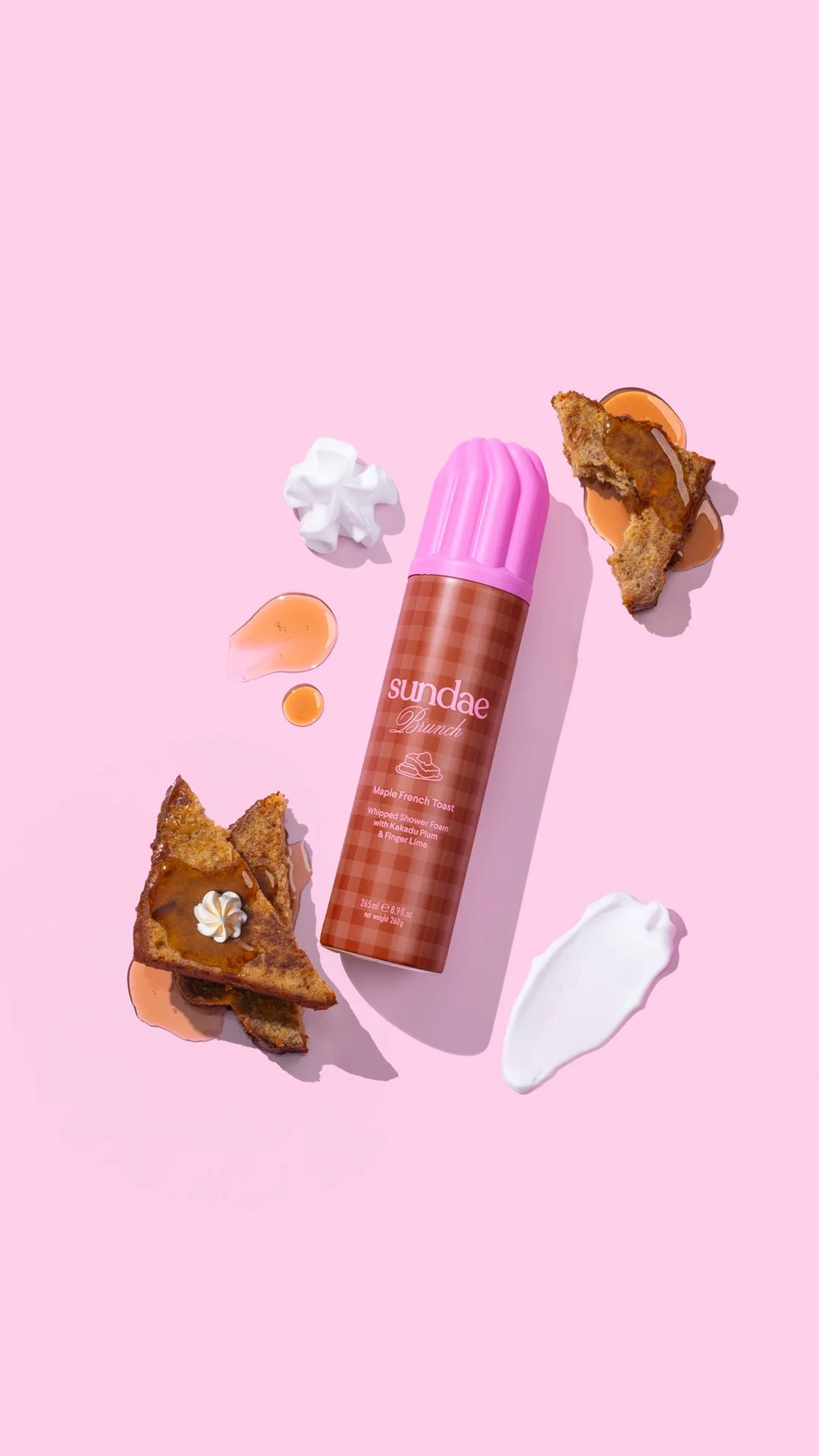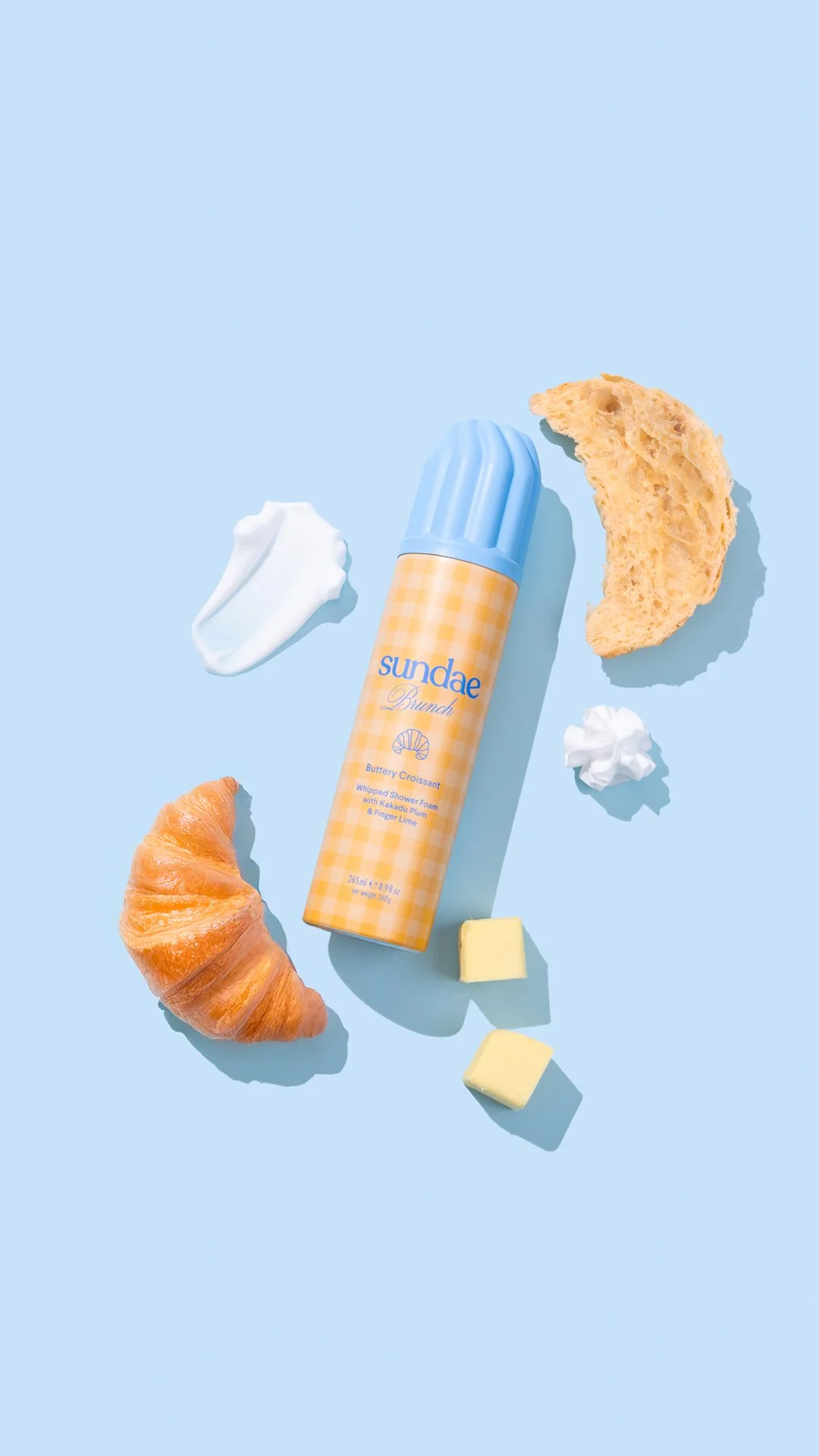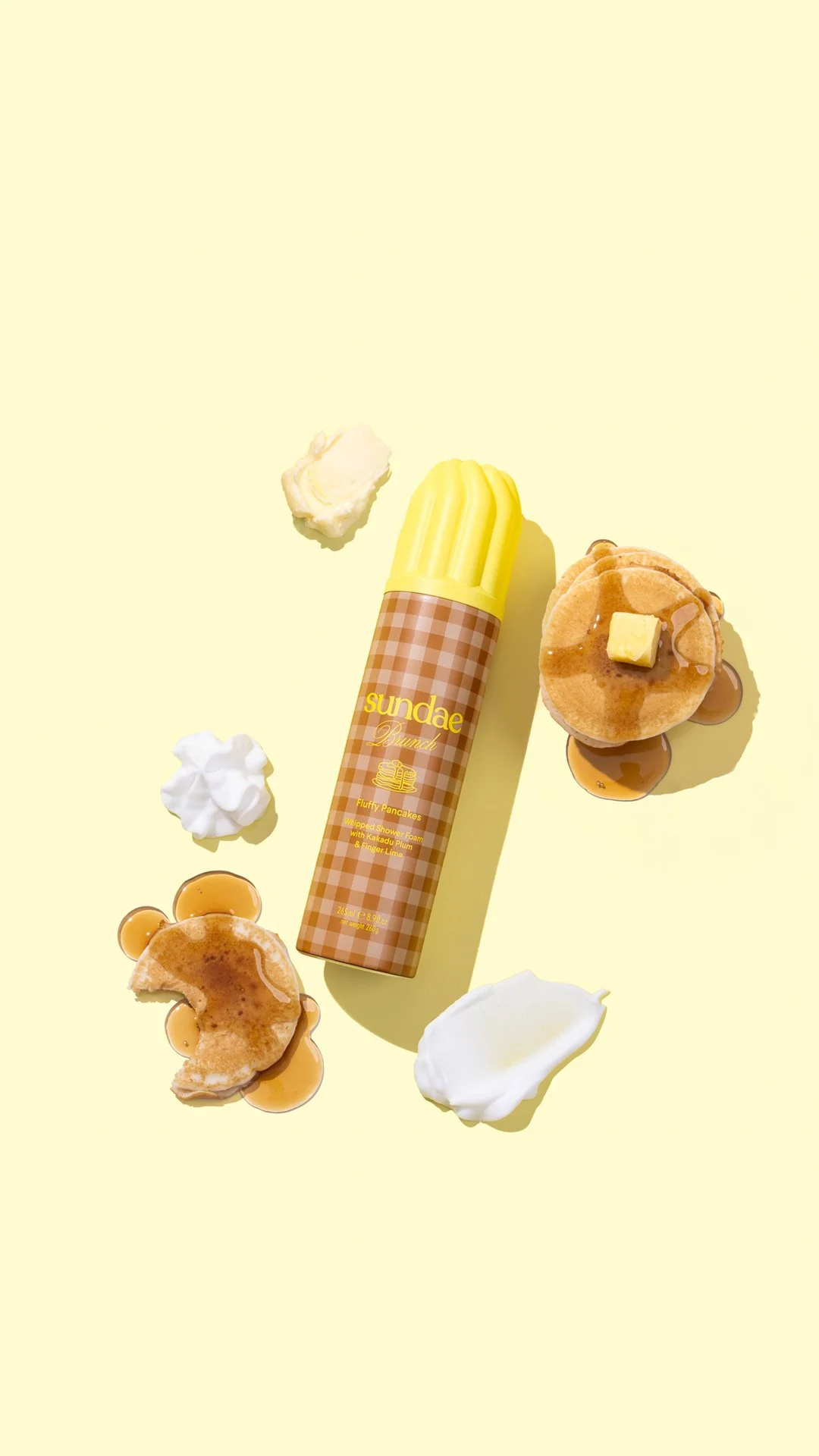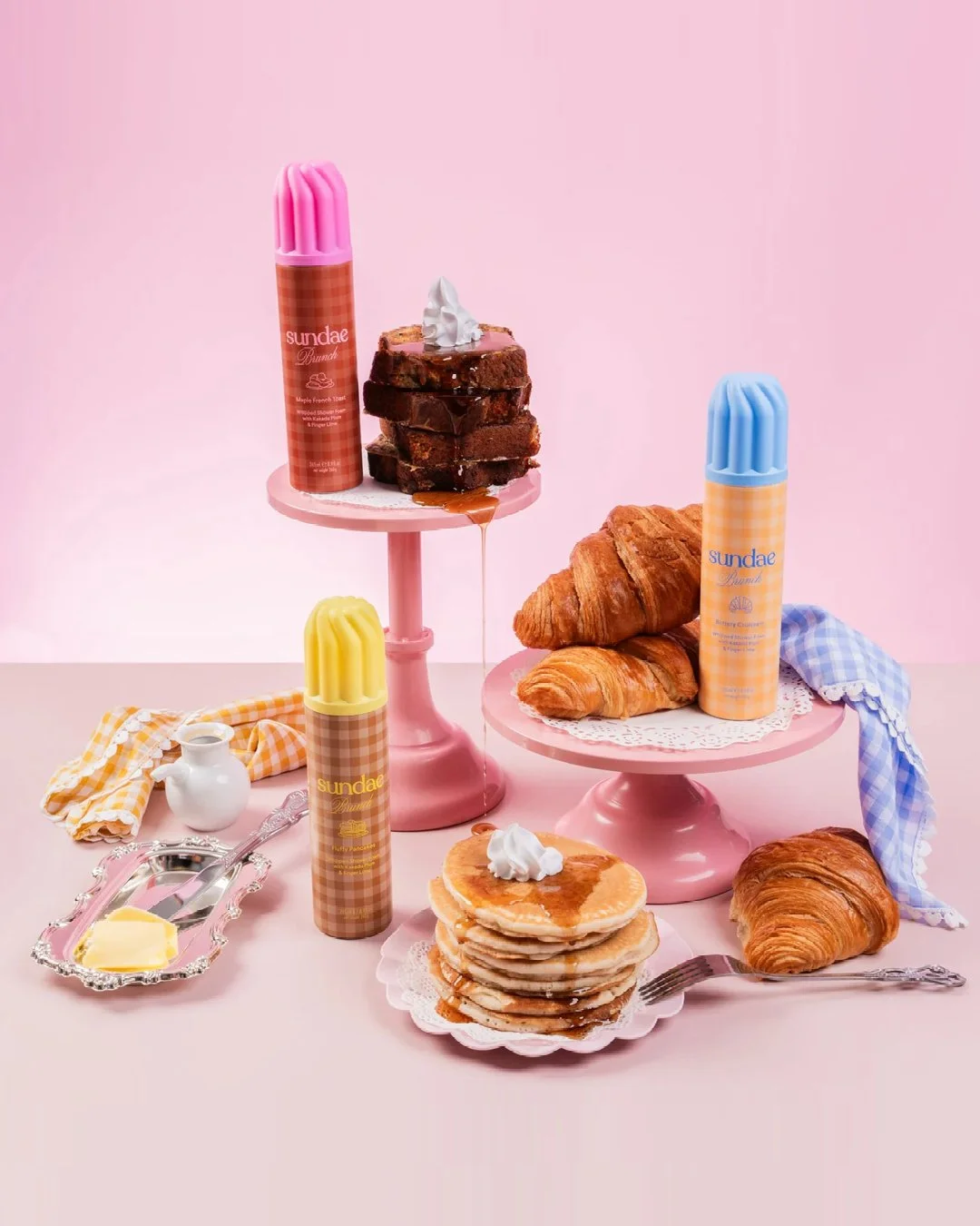 Packaging design for @sundaebody ‘Sundae Brunch’. The concept draws from nostalgic brunch settings and their sensory appeal, think gingham tablecloths, warm lighting and tones that mirror the scents in the range, Fluffy Pancakes, Buttery Croissant and Maple French Toast Foaming Body Wash.