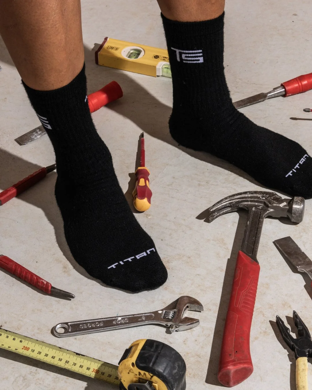 Branding, social media templates, packaging design and creative direction. TitanSox delivers industry-defining durability, unmatched comfort and next-gen innovation, built for tradies and tested on worksites. Engineered with durable water-resistant (DWR) coating to keep your feet dry, Merino wool for climate control, CopperCore fibres to fight odours and TitanGrip support to keep everything locked in place.